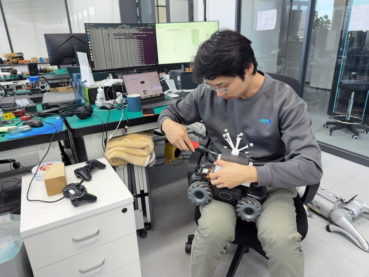 空間升級首先夯實了科研的硬件基礎。科技學院機電工程專業博士生楊士遠從事異構多機器人系統研究,過去因場地受限,難以同時部署多個機器人進行複雜交互。如今在橫琴,寬敞且低干擾的環境讓他能同時運行多台機器人進行精準聯動調試,硬件條件的升級直接加速了算法驗證的周期。